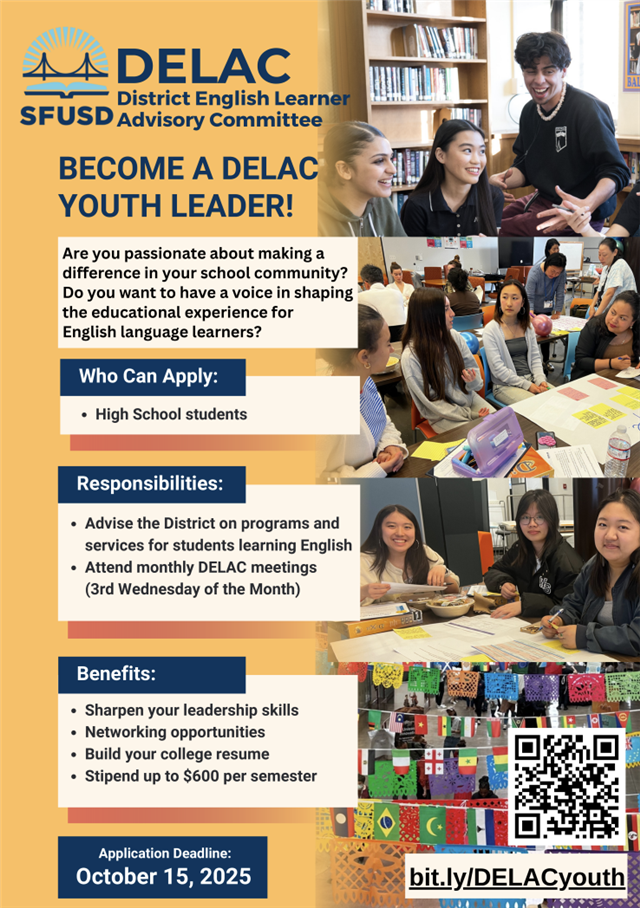 The DELAC Youth Leaders Program empowers Multilingual Learner students to uplift their voices and advocate for equity and inclusion across the district. Youth leaders will collaborate with district staff, participate in leadership development activities, and contribute their insights to improve programs and services for Multilingual Learner students.